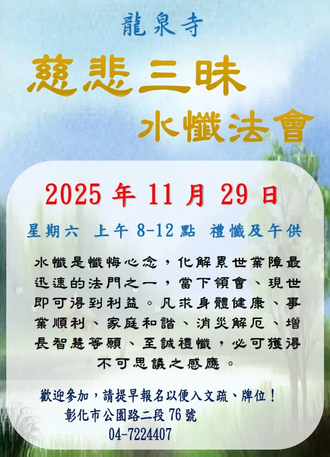 114年11月29日(六) 上午8-12 慈悲三昧水懺法會及佛前大供 歡迎十方大德踴躍參加!!